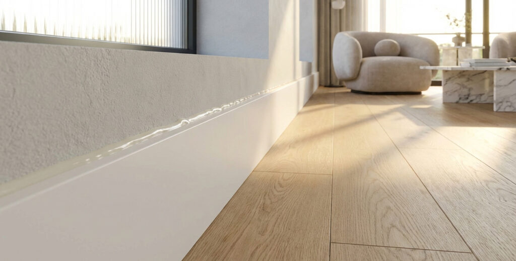 El encuentro entre rodapié y pared es clave. Un sellado mal hecho arruina el acabado final. Problemas que genera – Ondas visibles – Acabado “sucio” – Sensación de descuido Cómo evitarlo – Usa adhesivos de montaje de calidad, compatibles con superficies lacadas. minimizar juntas visibles. – Aplica poca cantidad y alisa correctamente. – El objetivo es cerrar la junta, no crear una línea gruesa visible. – Menos es más, especialmente en rodapiés lacados