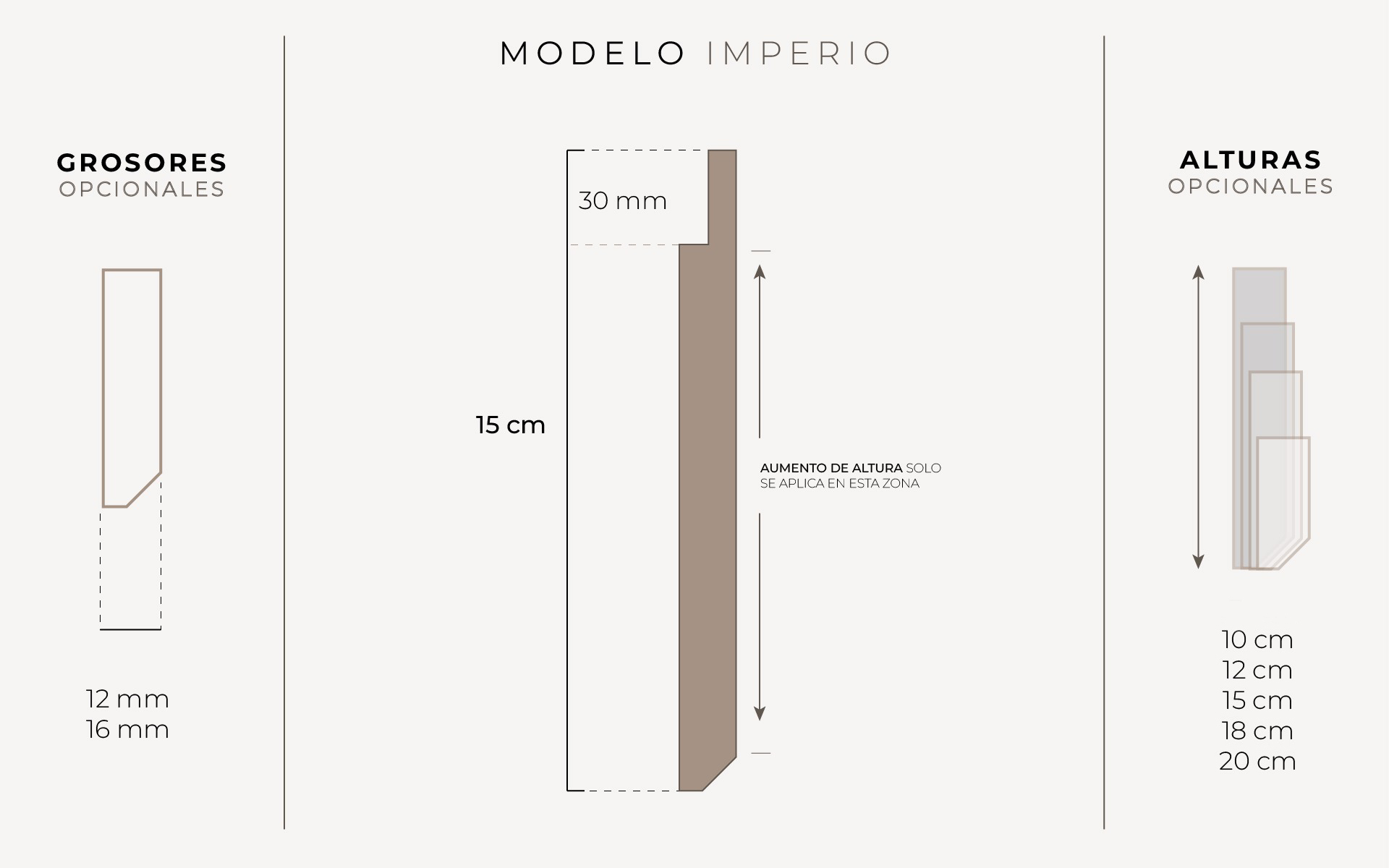 El modelo IMPERIO destaca por su diseño sobrio y moderno, con un perfil superior suavemente escalonado que aporta un matiz decorativo sin estridencias. Una solución elegante y versátil para quienes buscan un remate limpio pero con personalidad. Fabricado en DM hidrófugo de alta densidad, garantiza durabilidad, resistencia a la humedad y acabado lacado profesional sin melamina. Es la elección perfecta para interiores modernos y atemporales.