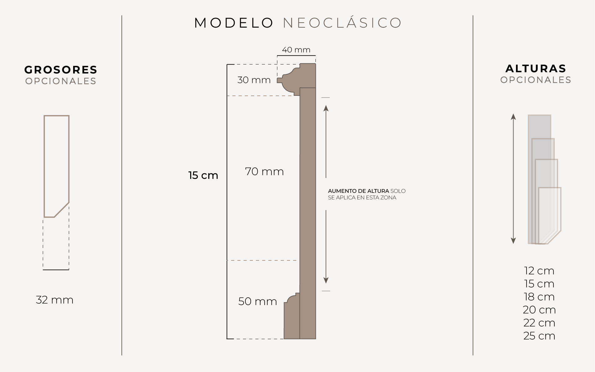 El modelo Neoclásico destaca por su equilibrio entre sobriedad y presencia decorativa. Su diseño combina una base ancha y sólida, que aporta estabilidad visual, con una moldura superior refinada, creando un juego de proporciones inspirado en la arquitectura clásica. Fabricado en DM hidrófugo, garantiza durabilidad, resistencia a la humedad y un lacado profesional sin melamina.