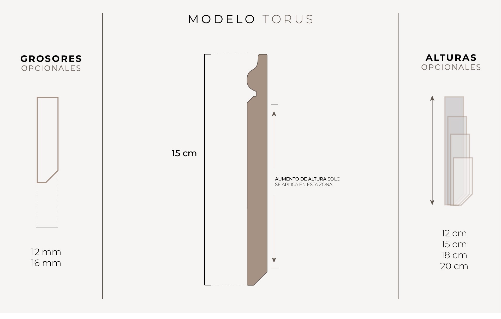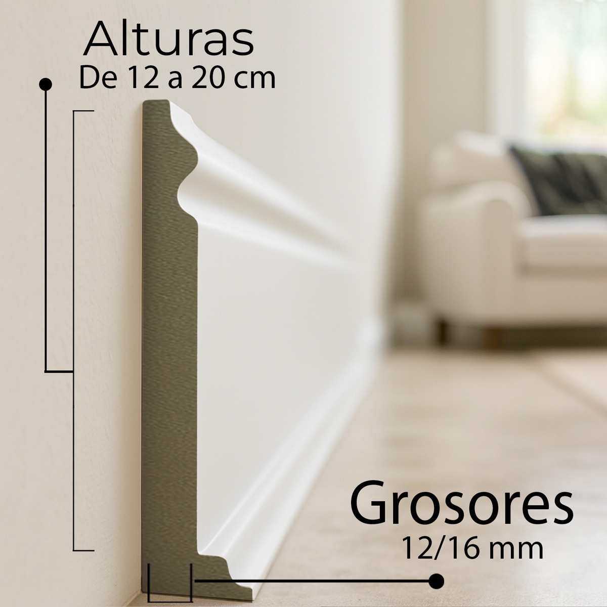 Este rodapié combina la esencia clásica de las molduras decorativas con un acabado actual y limpio. Su perfil superior redondeado añade volumen y carácter sin resultar recargado, aportando un equilibrio perfecto entre sobriedad y distinción. Fabricado en DM hidrófugo, garantiza durabilidad, resistencia a la humedad y un lacado profesional sin melamina.