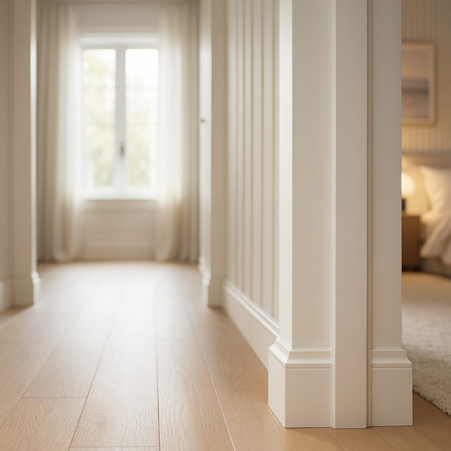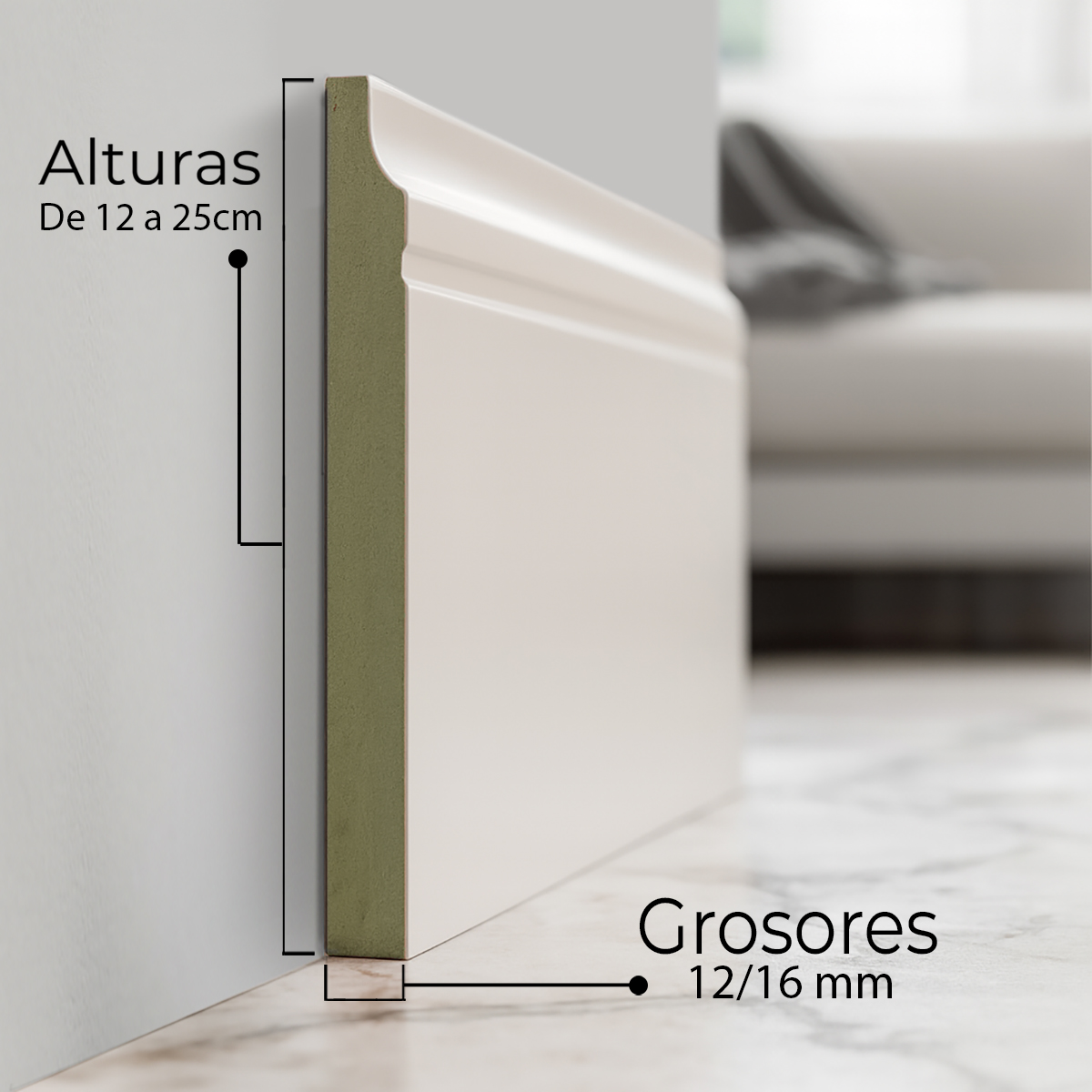 Un rodapié que no pasa desapercibido. Su moldura superior le da ese aire distinguido propio de las casas señoriales, mientras que el blanco puro y su acabado lacado lo hacen perfecto para proyectos actuales. Fabricado en DM hidrófugo, garantiza durabilidad, resistencia a la humedad y un lacado profesional sin melamina.