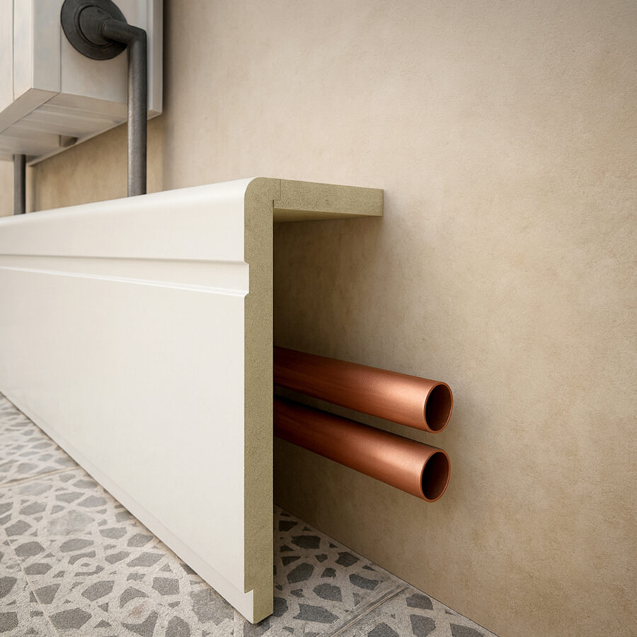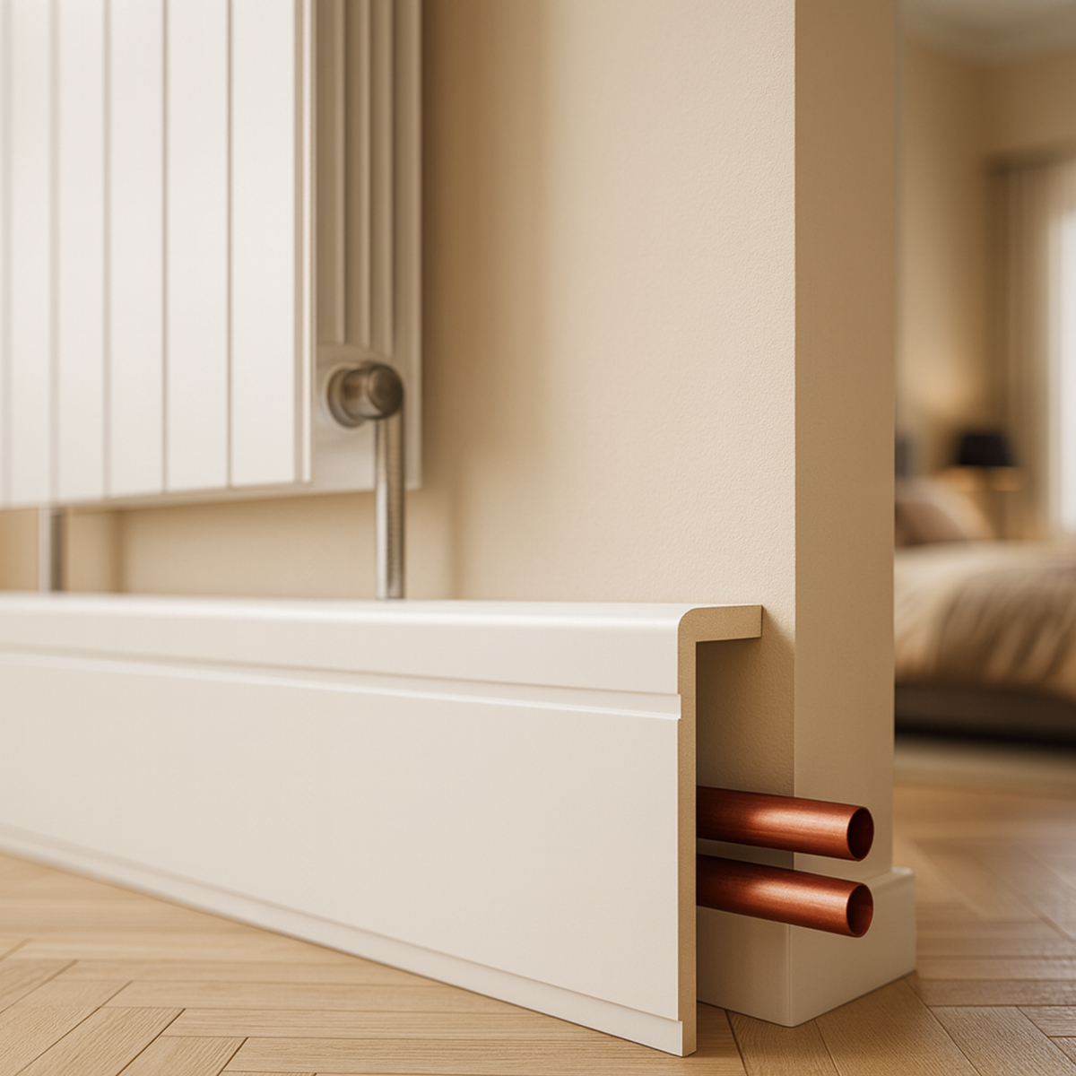 Diseñado para quienes aprecian las líneas limpias y la armonía visual, el Rodapié Cubre-tubos Elegant oculta instalaciones como tubos de calefacción de forma discreta y sofisticada.