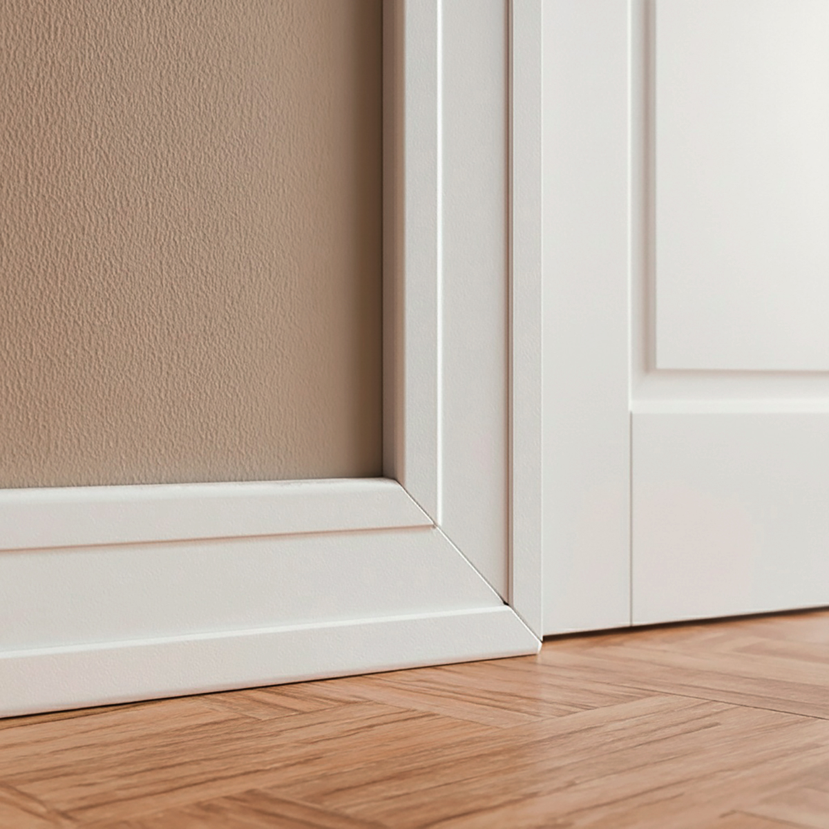 Su moldura suave y proporcionada realza puertas y paredes, y puede instalarse como divisor decorativo o unirse al rodapié mediante inglete para crear un rodapié infinito que recorra toda la estancia.